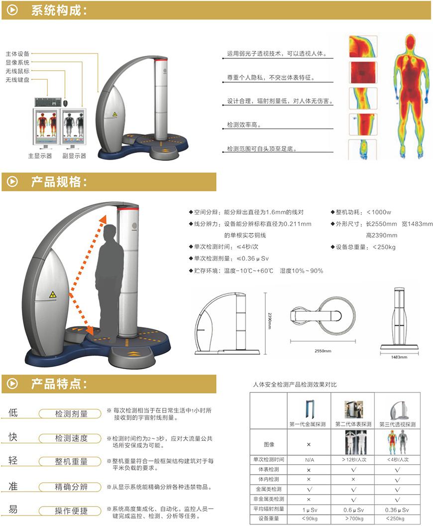 采用弱光子透視技術(shù),不顯示人體表特征,能極好地保護(hù)被檢測(cè)者隱私;而國(guó)外毫米波、背散射掃描技術(shù)裸露 人體表特征,不能有效保護(hù)被檢測(cè)者的隱私(被戲稱裸體探測(cè)儀)。