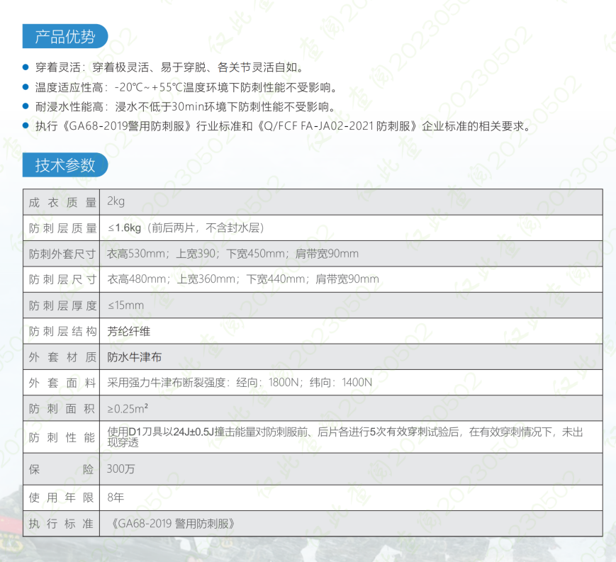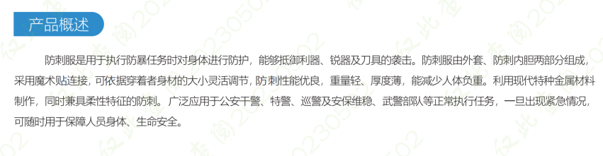 防刺服是用于執(zhí)行防暴任務時對身體進行防護,能夠抵御利器、銳器及刀具的襲擊。防刺服由外套、防刺內膽兩部分組成,采用魔術貼連接,可依據(jù)穿著者身材的大小靈活調節(jié),防刺性能優(yōu)良,重量輕、厚度薄,能減少人體負重。利用現(xiàn)代特種金屬材料制作,同時兼具柔性特征的防刺。廣泛應用于公安干警、特警、巡警及安保維穩(wěn)、武警部隊等正常執(zhí)行任務,一旦出現(xiàn)緊急情況,可隨時用于保障人員身體、生命安全。