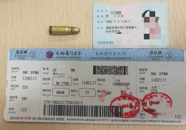 12月11日,廈門高崎機場T4航站樓查獲一男子攜帶子彈一起。當日上午08:03左右,廈門安檢正在對前往長沙的旅客陳某進行安檢,旅客隨身攜帶單肩包一個,當旅客將包放入X光機檢查時,開機員小尉發現包中物品圖像有兩個黑點,疑似子彈,于是通知開包員小張控制行李并開包檢查,當問及陳某包中是否有子彈之類的金屬物品時,旅客予以否認。開包員小張將該包仔細檢查,最后在包內夾層中發現了疑似子彈一發。經過再次過機檢查并且詢問當事人,當事人承認這是一枚子彈。隨后,安檢員通知值班班長將當事人和該物品都移交機場公安機關處理。